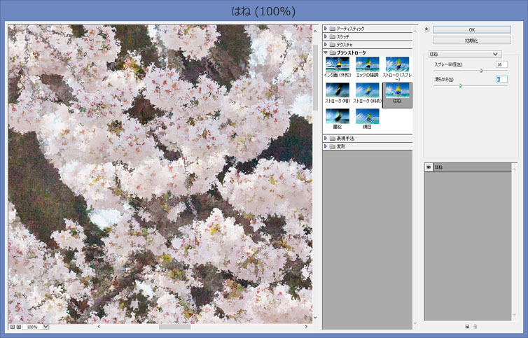 - [フィルタギャラリー]→[ブラシストローク]→[はね]