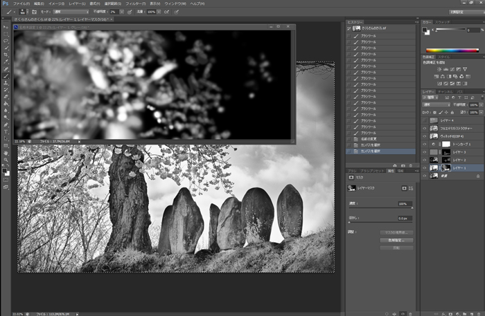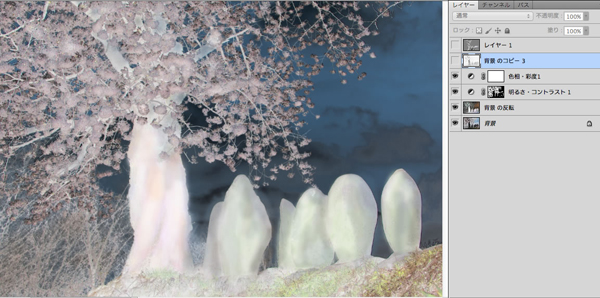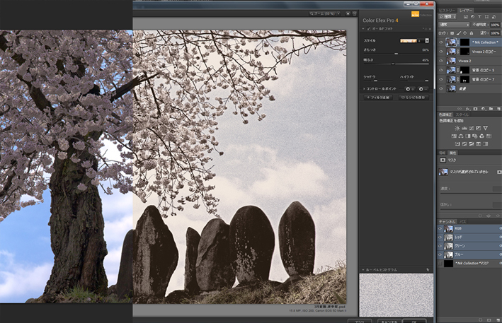 Photoshopで諧調の反転をしたら色調を180度戻す。元画像には[トーニング]で樹皮と石塚をイエローベージュに、桜の花をアッシュローズにトーニング。それらを重ねて、の[フィルター]→[ぼかし(ガウス)]でぼかして、全体に色を乗せる(1版目) - 樹肌や石肌のデティールを出したいので、NIKの[SILVER EFEX PRO2]でモノクロ化し、トーニング(2版目)