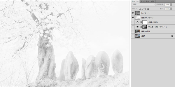 - Raw現像ソフト[CaptureOnepro7]で、ベース画像、白とびの補完用、黒つぶれ補完用という計3枚の画像を作成し、Photoshop上でレイヤーとして重ねる(この時点で白黒化、コントラスト低下、および各濃度に合わせた階調調整を実施)