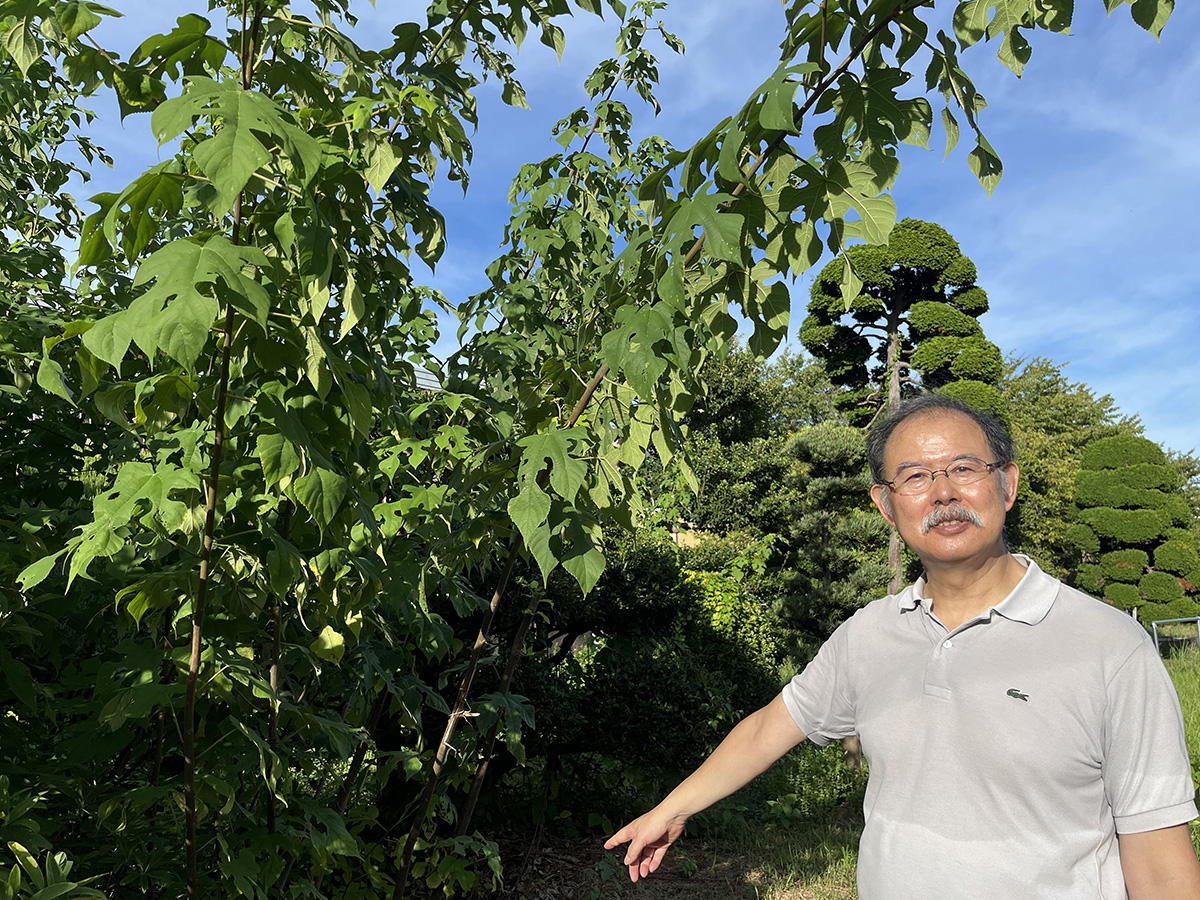 大豐和紙工業の敷地内に生育している楮(コウゾ)の木。楮は繊維が強く1年に1回刈り取ります。雁皮は繊維が短く柔らかいので扱いが難しいそうで、5年に1回しか刈り取れません。三椏は楮と雁皮の中間の性質を持ち、女性の肌のよう。芭蕉はコシがあり、扱いやすい材料だといいます。