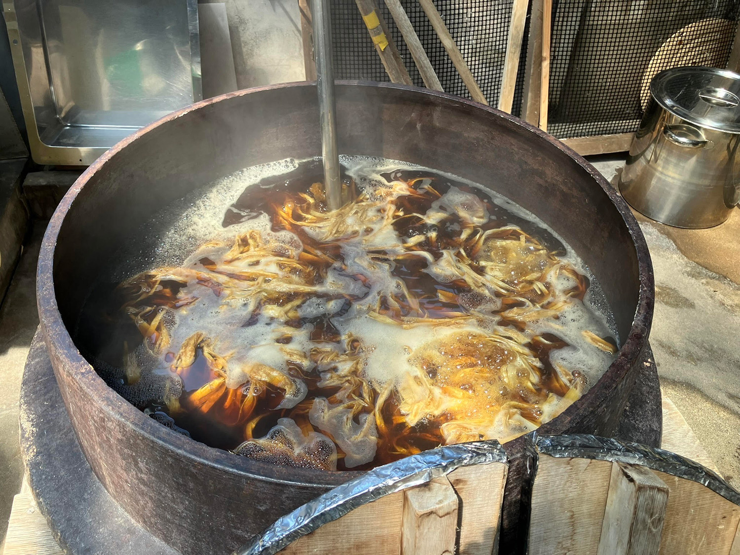 収穫後、乾燥させておいた木の皮は水につけて水分を含ませて繊維を柔らかくします。それを大釜に入れて煮ます。繊維を固めているペクチンなど不要な物質をソーダ灰(無水炭酸ナトリウム)で溶かして解しやすくします。