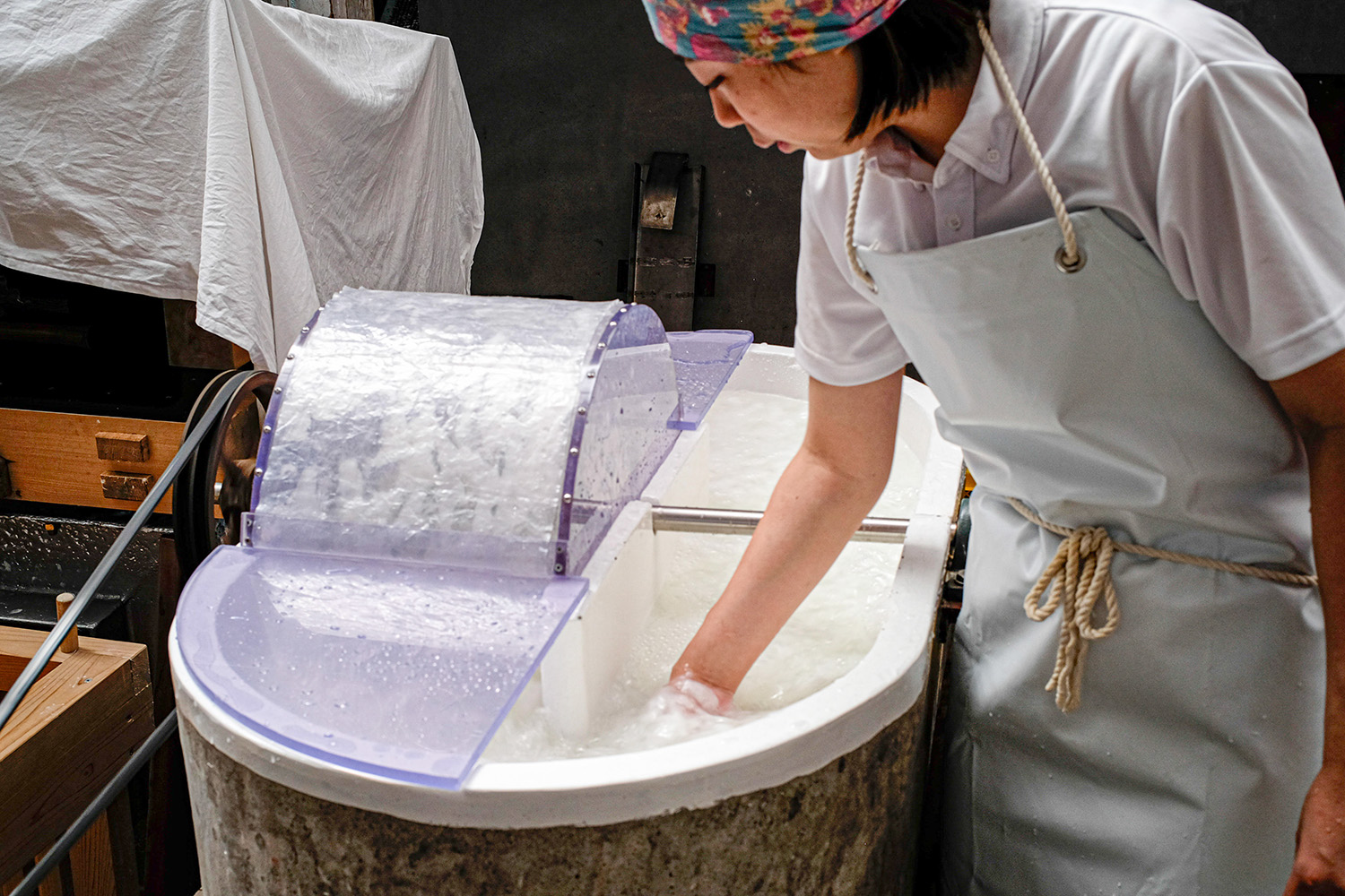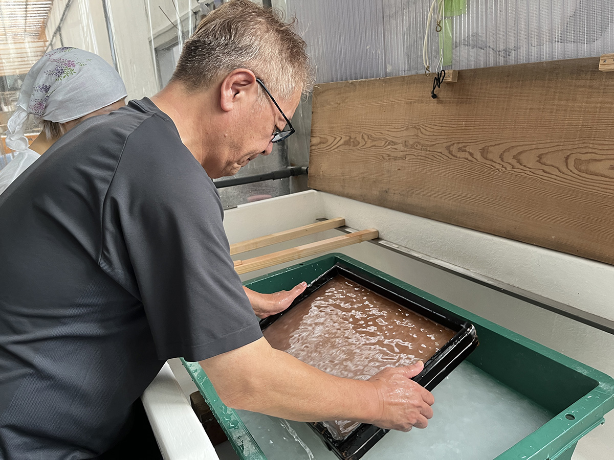 The softened fibers are placed in a machine (beater) and beaten in water to break them down. How well the fibers are treated determines the texture of the finished paper. The fibers are then poured into a vat of water, stirred thoroughly, and mixed with a natural thickening agent (tororo-aoi) to ensure an even dispersion.