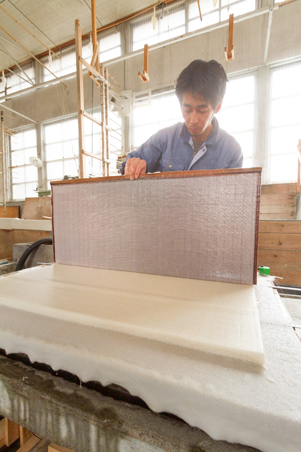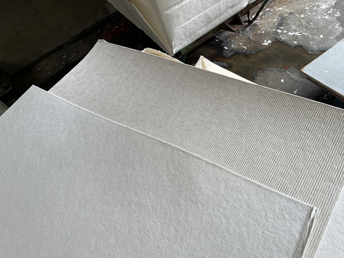 Once the sheet has been formed evenly, it is placed face-down on a wet board (shitoita) and stacked. In this wet state, the paper is very soft. Threads (sube) are placed along the edges of the sheets.