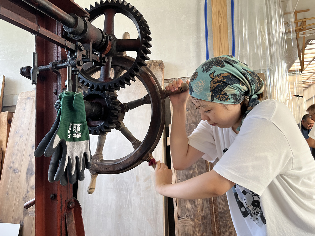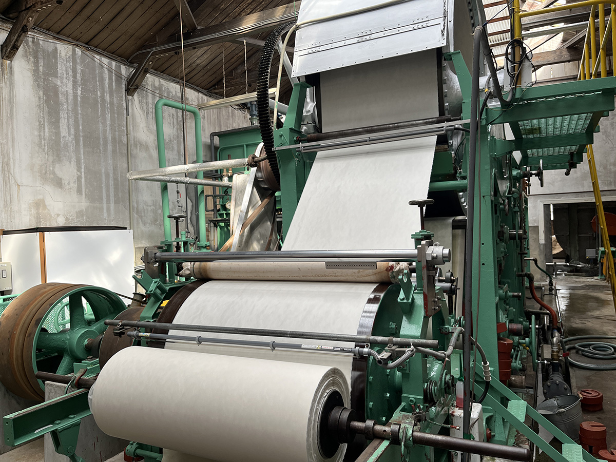 The process of making paper is called shōshi (papermaking), and this machine is known as a Yankee paper machine. The reason it is called “Yankee” is unclear, but it is enormous―about 10 meters long and 6 meters high. It was manufactured in 1970.