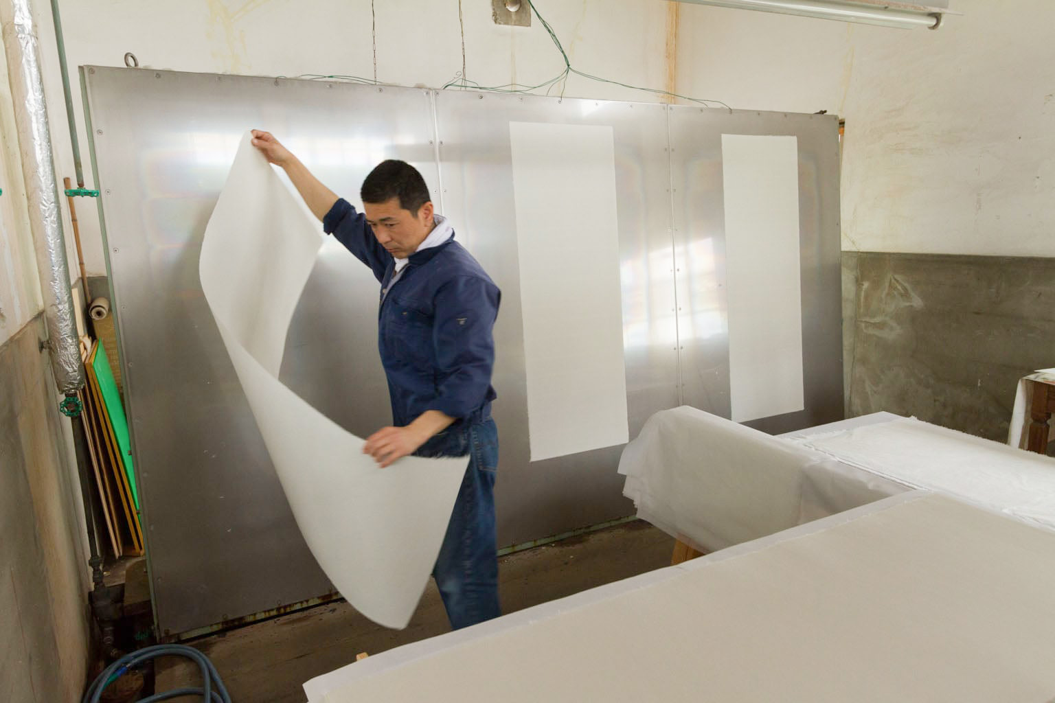 重なっている紙を、糸(すべ)を手がかりにして1枚ずつ剥がし、シワにならないようにハケを使って張り板に張り、天日で乾燥させます。蒸気で熱したステンレス板に張って乾燥させる場合もあります。