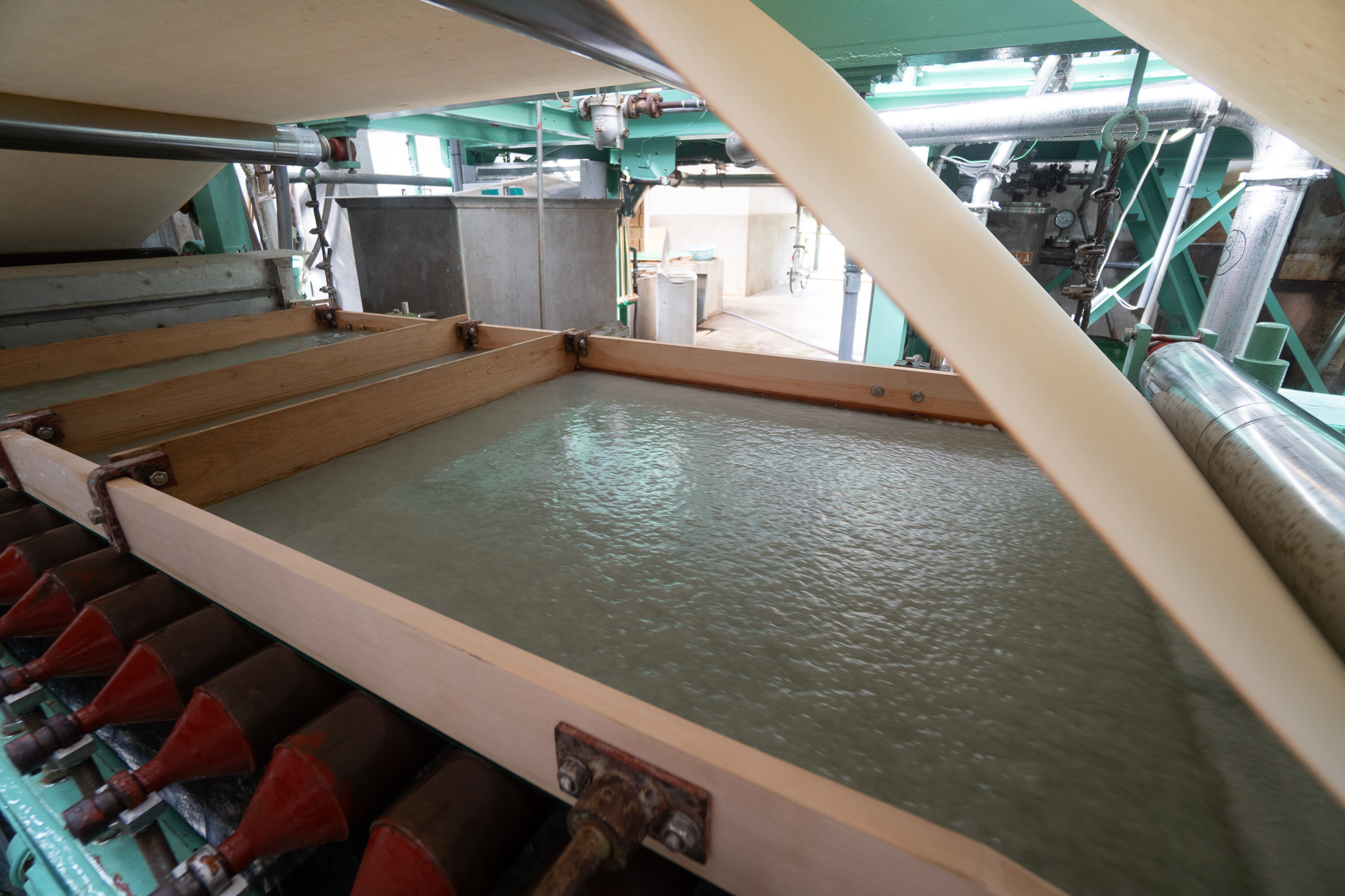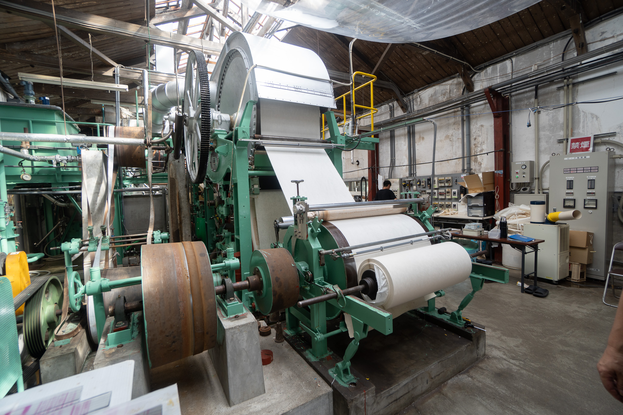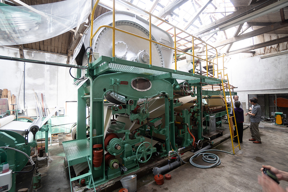 紙を漉くことは「抄紙(しょうし)」といわれ、これはヤンキー抄紙機と呼ばれています。なぜ「ヤンキー」なのかは不明ですが、全長は10m、高さは6mくらいと巨大です。1970年製。