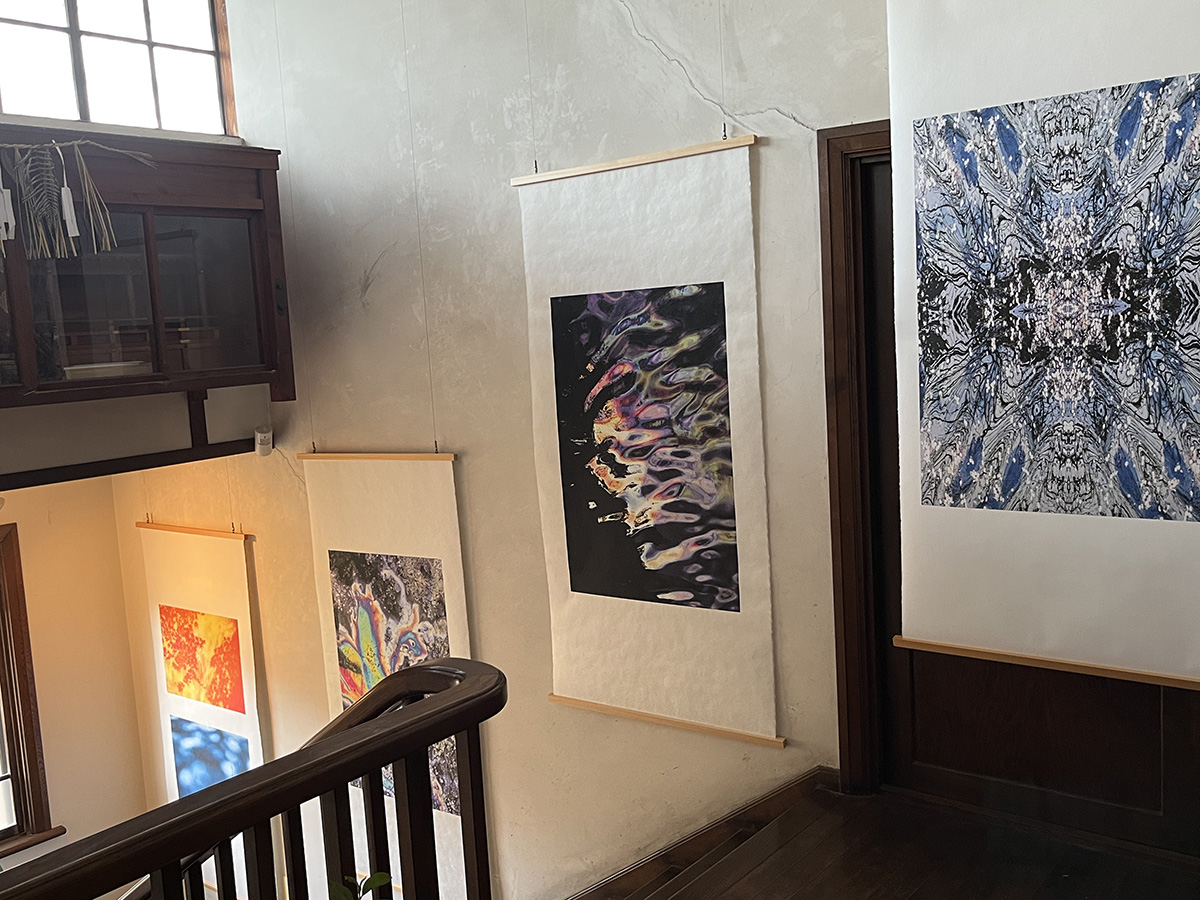 For this exhibition in Mexico, all works will be displayed using wooden bars like these instead of frames. We thought they would complement the traditional Japanese washi paper prints (the works shown here are by another artist currently on display).