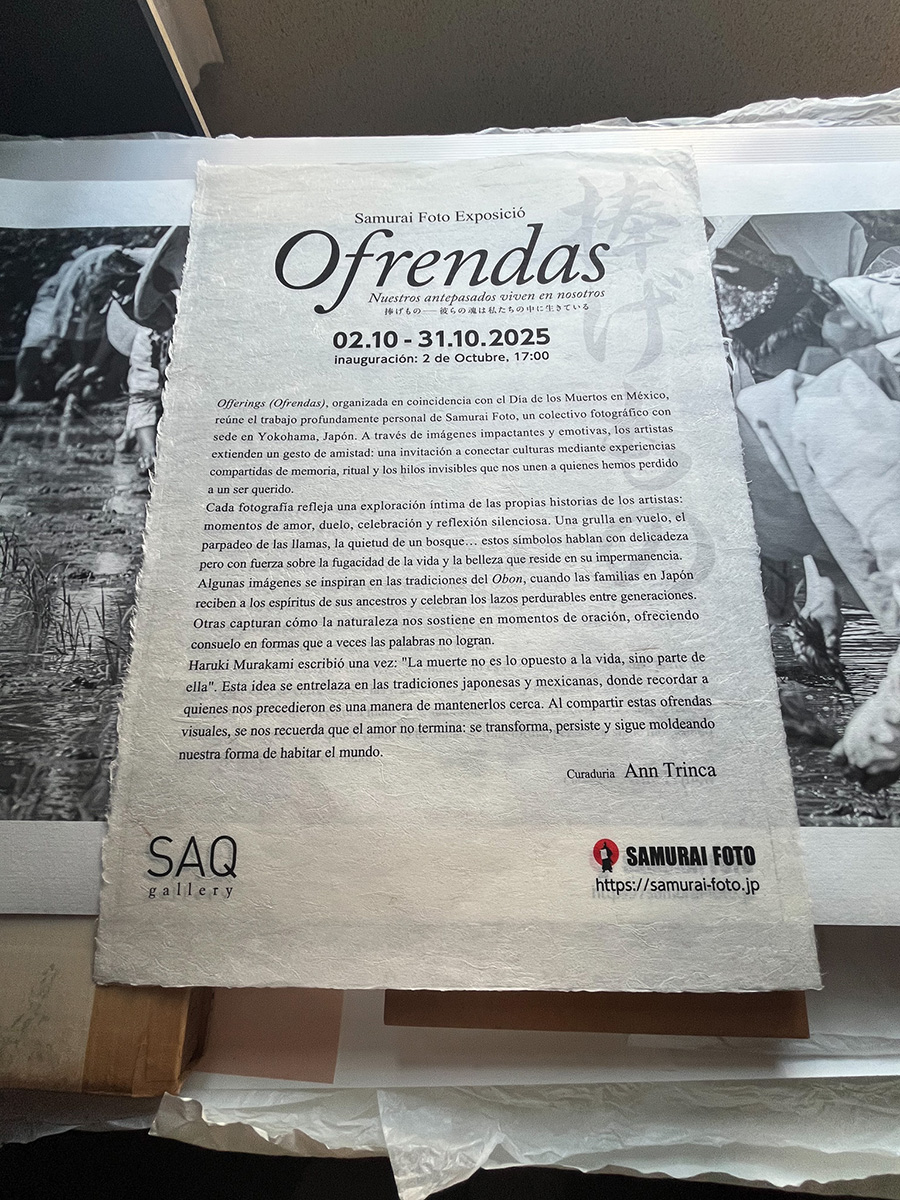 The SAMURAI FOTO exhibition “Ofrendas (Offerings)” will be held at the SAQ Gallery in Mexico City from October 2 to 30, 2025. For this show, most of the works’ paper and prints were produced by IseWashi.