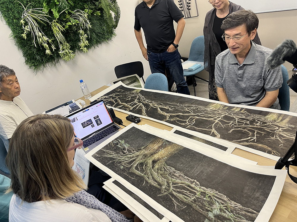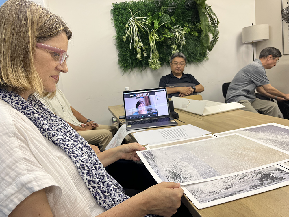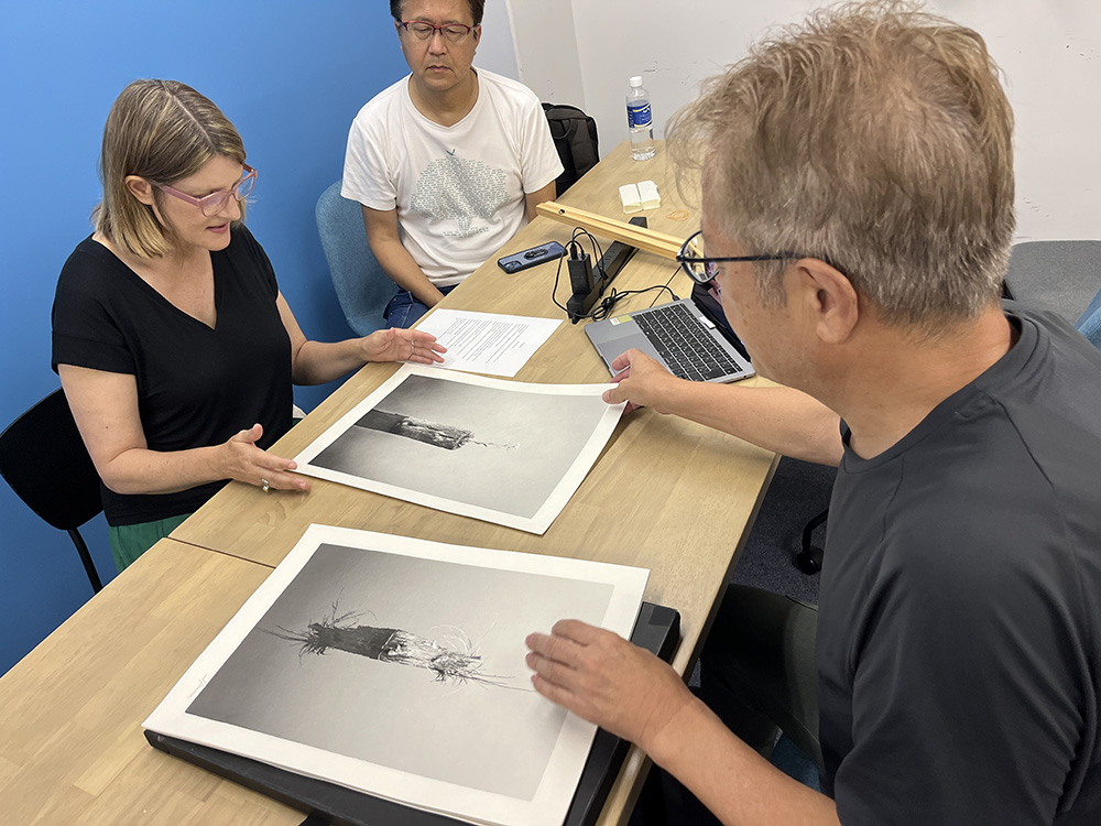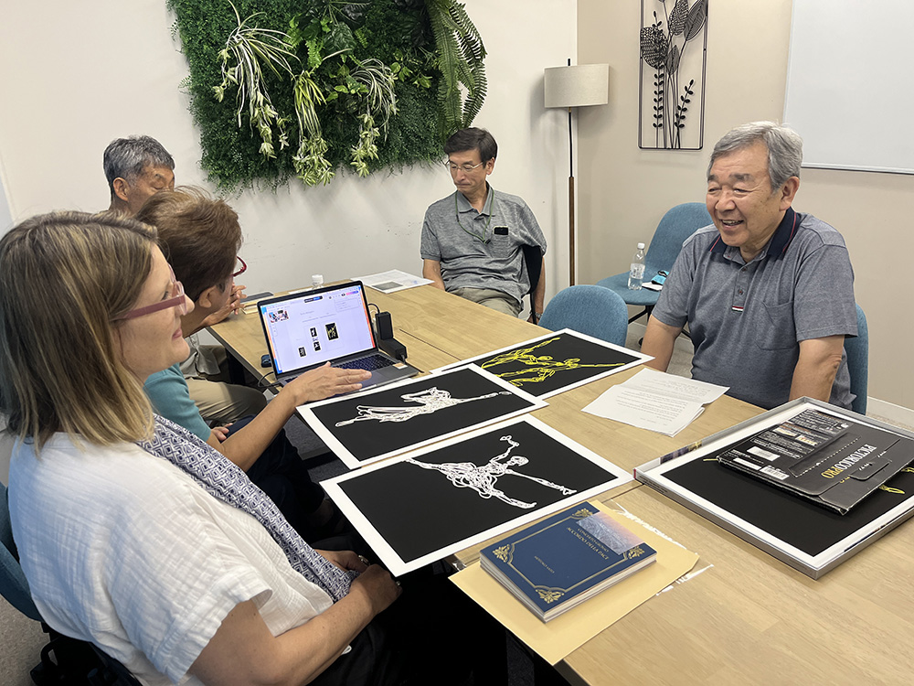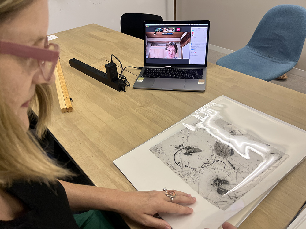 Mariko Masumoto, based in Kobe, also participated in the review via Zoom. English interpretation was provided remotely by Yukiko Shikama, the wife of Takeshi Shikama. Seeing the prints and having direct conversations helped deepen mutual understanding and proved essential for shaping the exhibition successfully.